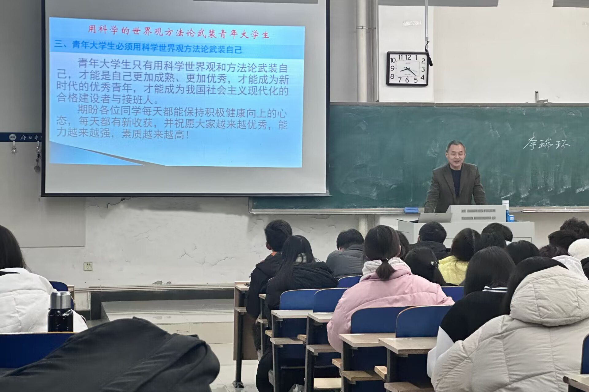 首先,吴明君老师结合诸多事实及身边案例分析了青年大学生树立科学的世界观方法论的重要意义。随后介绍了新时代习近平新时代中国特色社会主义思想的内容体系,提出习近平新时代中国特色社会主义思想是新时代的世界观和方法论,青年大学生必须做到:坚持人民至上,坚持自信自立,坚持守正创新,坚持问题导向,坚持系统观念,坚持胸怀天下。最后明确提出了青年大学生要从明确自己的价值、明确自己的目标、坚持自己的原则、坚持不懈的追求、坚持勇于改变、坚持接受挑战、坚持坚强、坚持学习、坚持梦想、坚持事业等十个方面用新时代科学世界观和方法论武装自己。