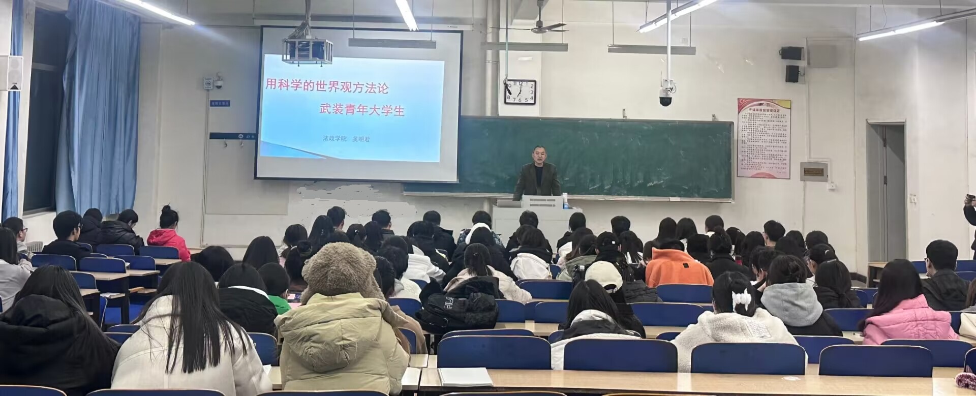 2023年11月24日晚7点,邢台学院法政学院学生党支部书记吴明君在公教楼505教室以《用科学的世界观方法论武装青年大学生》为主题,给学生讲党课,法政学院学生党员、2023年确定的发展对象及入党积极分子100余人参加。