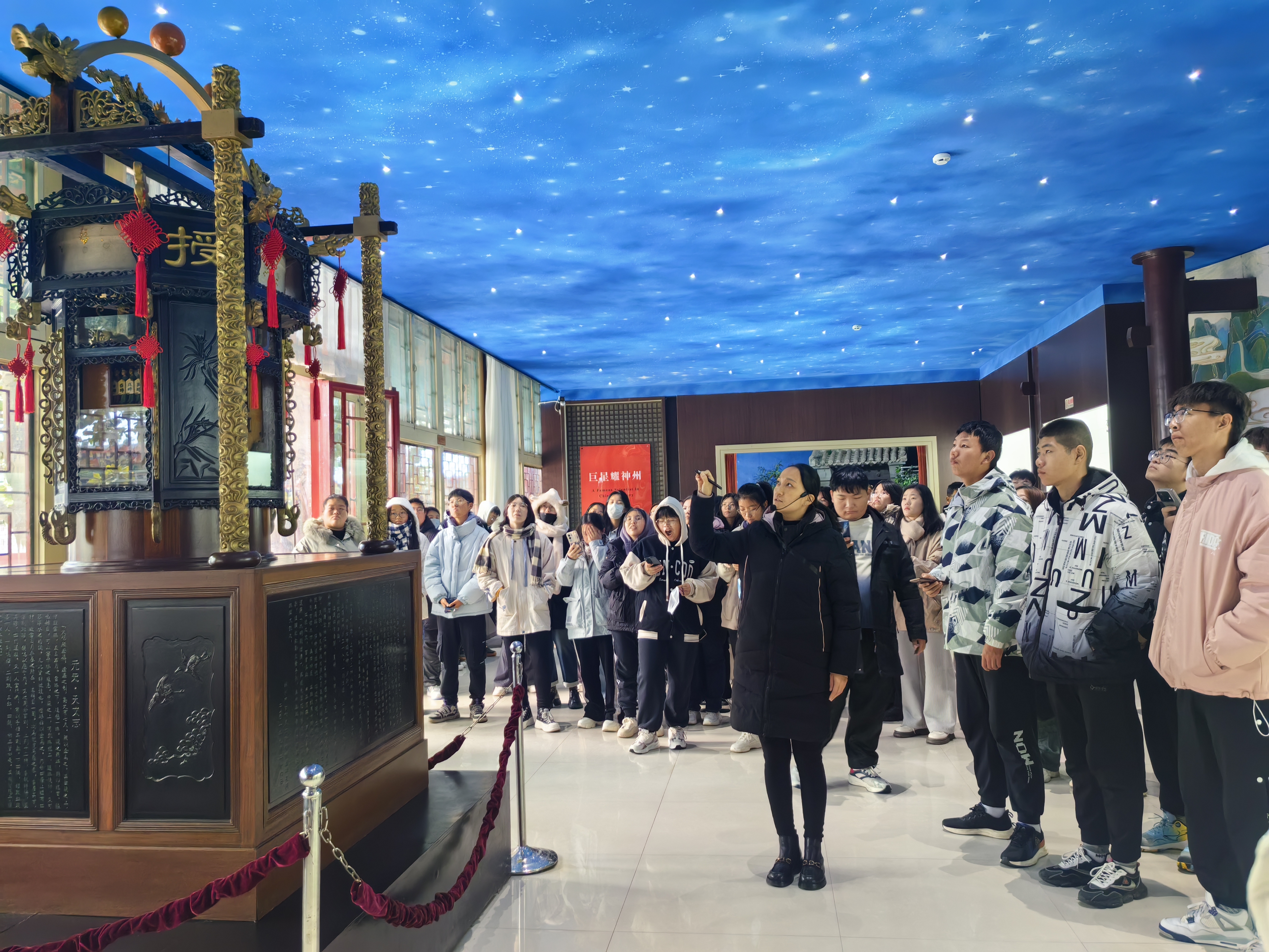 随后,同学们依次参观了巨星耀神州、治水树丰碑、天文建奇功、伟业照千秋四个展厅。展厅共有展品300余件,其中复制有郭守敬当年创制或使用过的简仪、浑仪、赤道式日晷等大型仪器;有反映郭守敬伏案工作,邢州治水、大都治水的模拟场景。