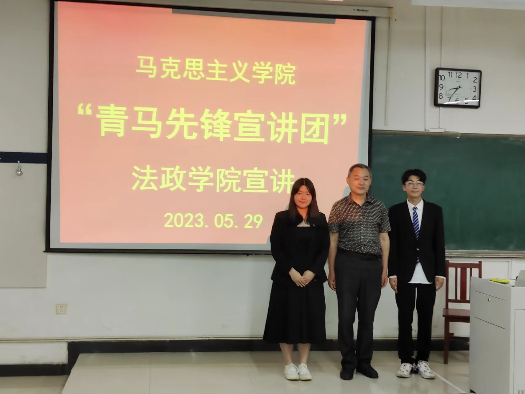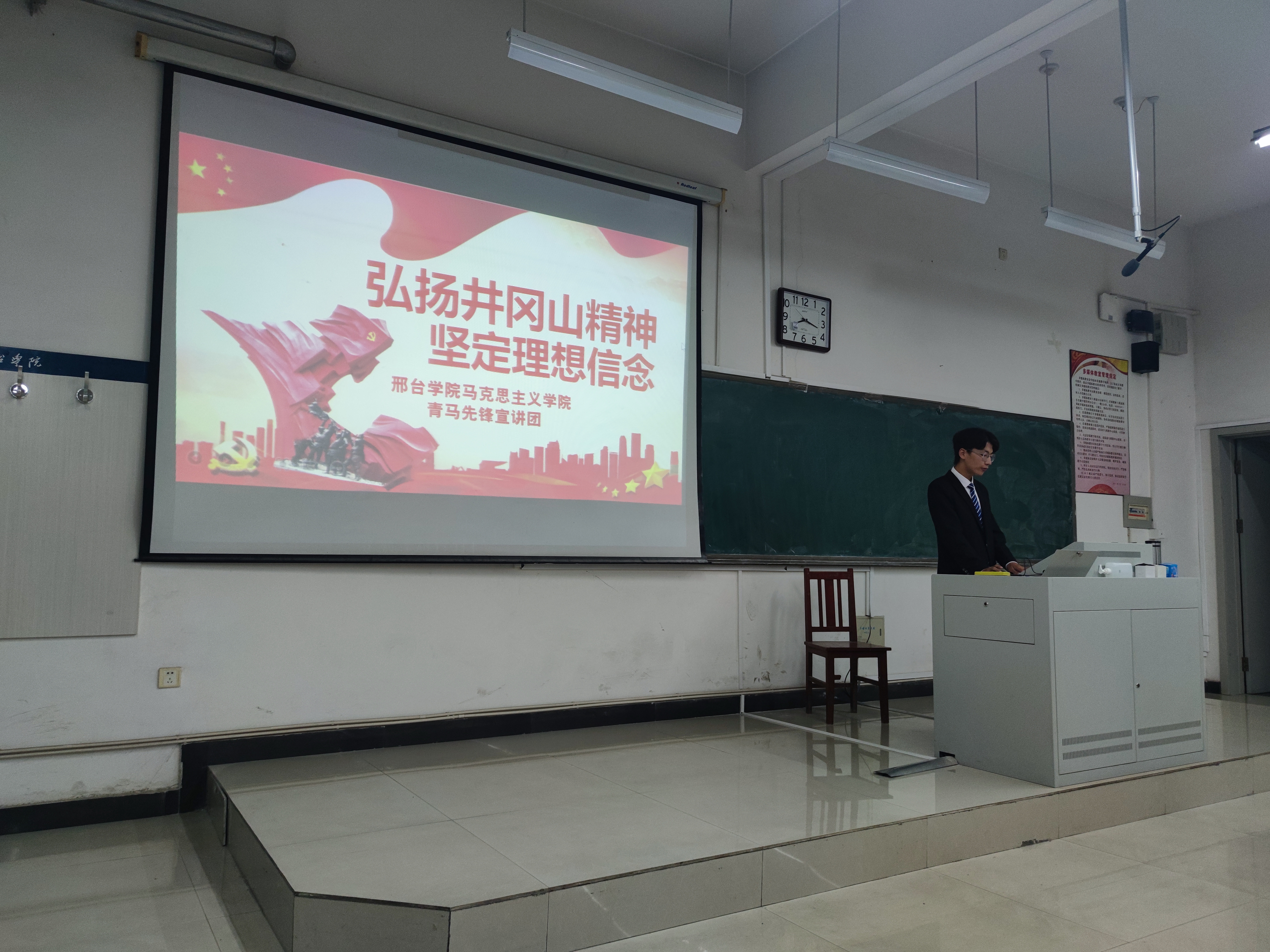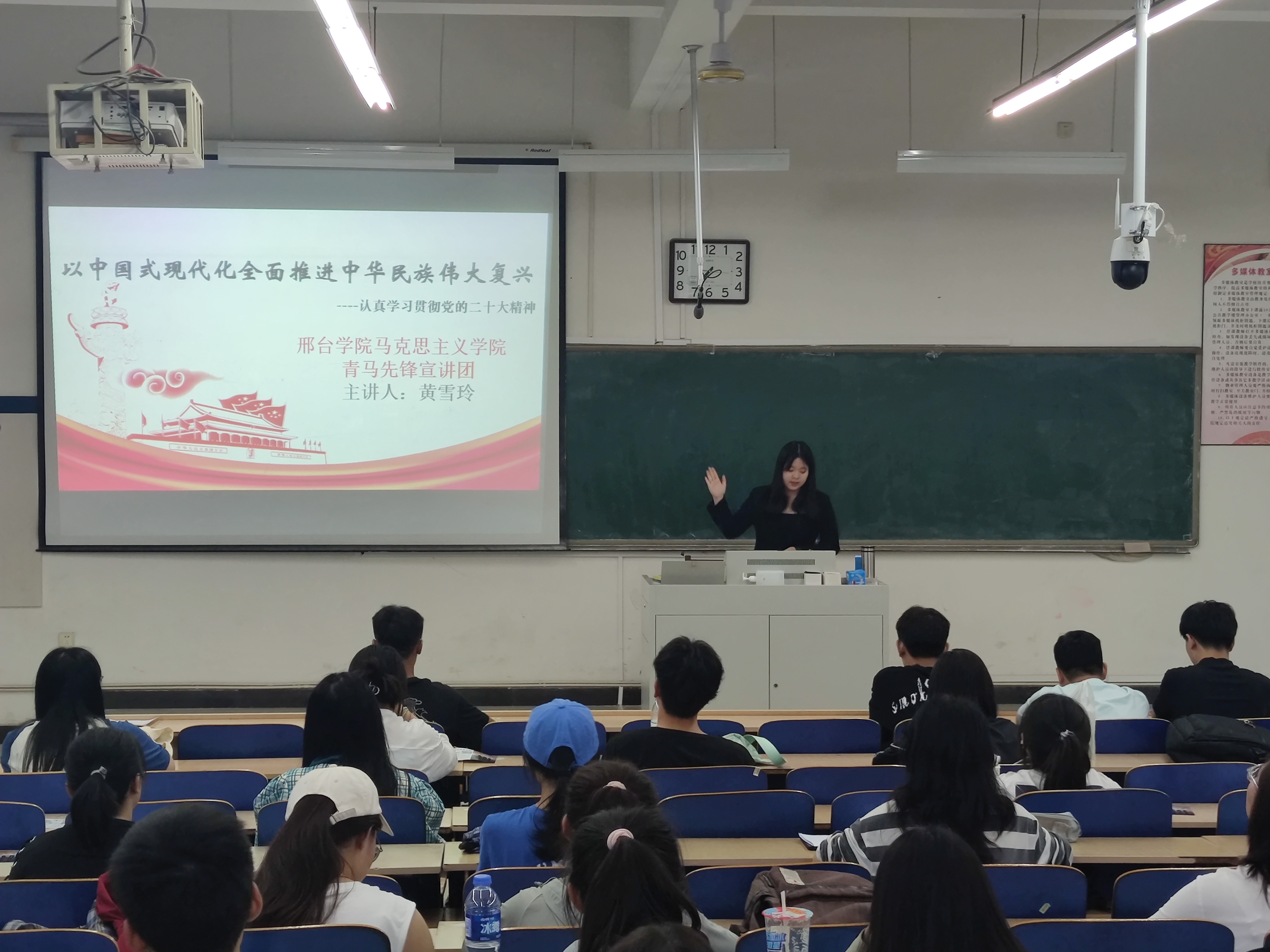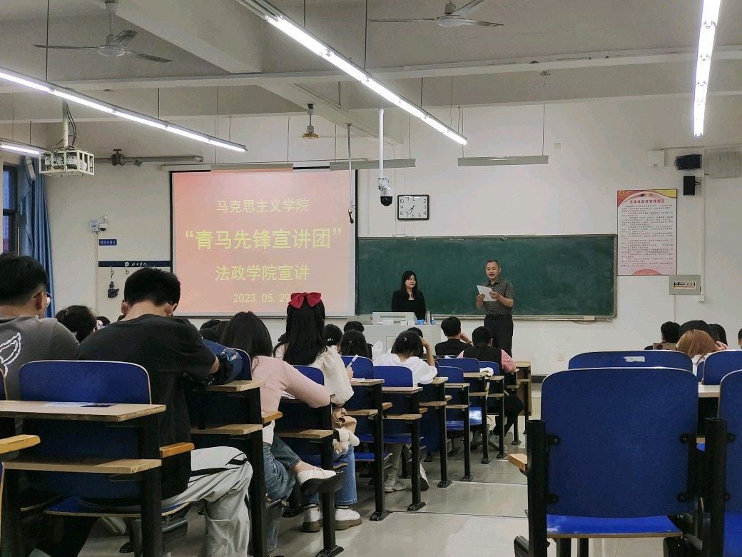 2023年5月29日晚,邢台学院马克思主义学院“青马先锋宣讲团”成员黄雪玲、乔雅宁在公教楼503教室为法政学院学生宣讲二十大精神,宣讲会由法政学院学管办主任吴明君主持,宣讲团成员黄雪玲、乔雅宁分别就“以中国式现代化全面推进中华民族伟大复兴”“推动绿色发展,促进人与自然和谐共生”“弘扬井冈山精神 坚定理想信念”进行了宣讲。